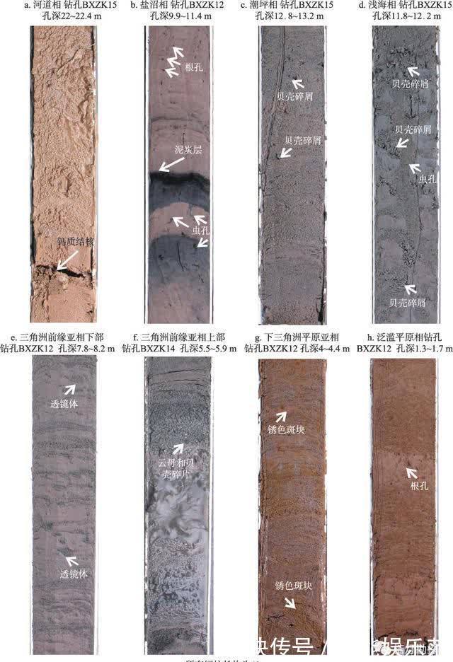 渤海湾南岸钻孔中典型的沉积相及沉积特征(图源@文献[8])平原分支流河道间的低洼地区常发育沼泽,主要沉积暗色有机质粘土,为弱还原或还原环境,整体向上发育砂层—粘土层—砂层, 常见水平层理、交错层理。