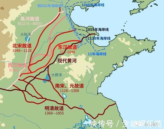 黄河的历史变迁(图?Stevenliuyi)三角洲平原多发育平原分支流河道、沼泽、天然堤等沉积。其中分支流河道沉积整体以正粒序为主,沉积速率大,河床淤积快,促使黄河成为著名的地上悬河。