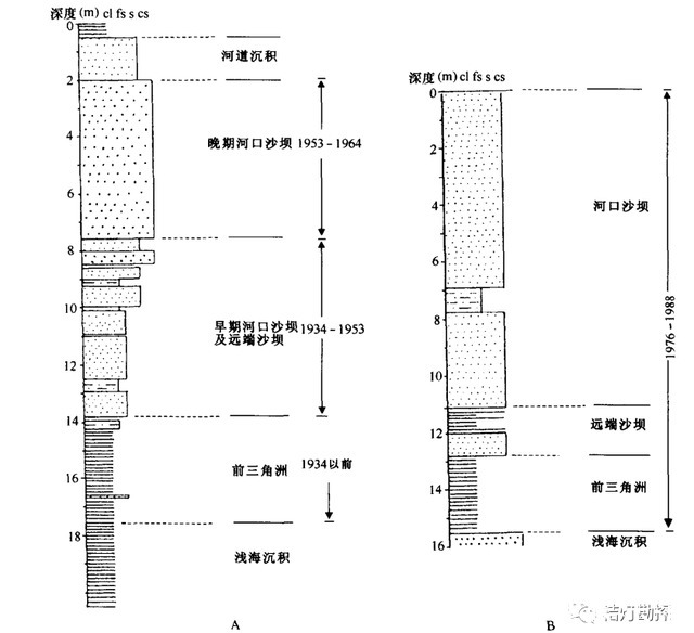 黄河三角洲河口沙坝型垂向序列(图源@文献[1])水下分流间湾指水下分流河道之间相对内凹的海湾地区,偶受波浪和风暴潮影响。沉积物以粘土沉积,含有少量粉砂和细砂,可见生物扰动构造。