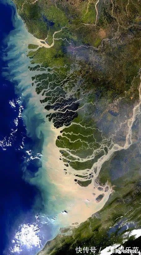 密西西比河三角洲(河控)(图源@NASA)潮控三角洲形成于潮差较大、潮汐活动比较活跃的河口地区。潮汐作用的最大特点是它的双向性。在沉积物的构造中会有相当显著的反映。